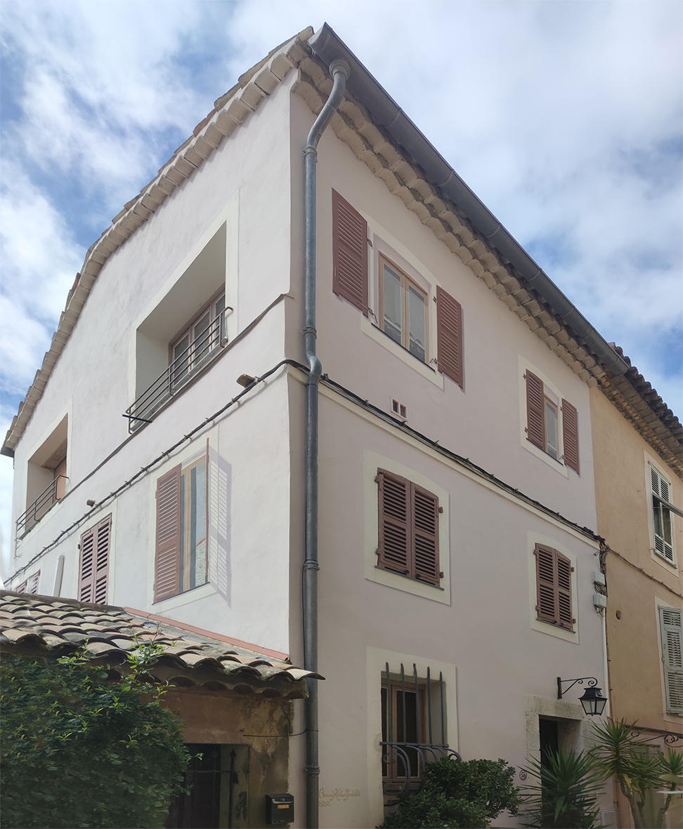 2011- Haut-de-Cagnes. (Alpes-Maritimes). Copropriété. (190 m2). Ravalement complet à la chaux. Trois fenêtres en trompe-l’œil (à la demande de l’ABF). Peinture minérale. Budget global : 90 000€