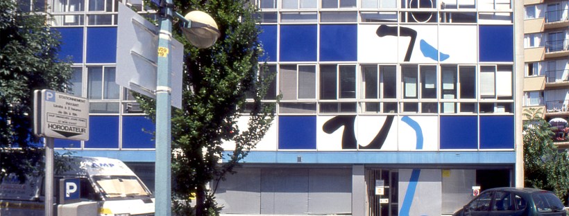 C’est à l’occasion de l’inauguration de la peinture réalisée par les stagiaires sur le pignon du bâtiment de la DDJS de Bobigny, que son directeur, fraîchement nommé à son poste, m’a demandé de réfléchir à un décor destiné à effacer cette couleur vert-gris en place (à gauche sur la photo ci-dessous ) et si peu avenante…