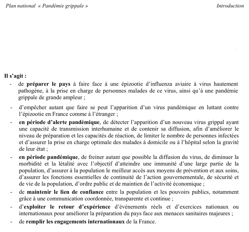 Pourquoi ce plan -qui en était à sa 4e édition en 2009 (!)- contenant toutes les directives suffisantes pour juguler une épidémie, et qui est en théorie applicable par les décideurs par obligation contractuelle (et morale…) n’a-t-il pas été mis en œuvre ? Y a-t- il eu défaillance ou existe-t-il des détours légaux qui justifieraient une telle « négligence » …?