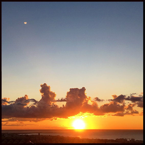 Clarté de l’air du matin de la Côte d’Azur : pas de voile atmosphérique, le disque solaire est posé sur la ligne d’horizon…