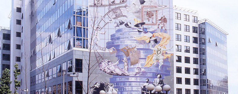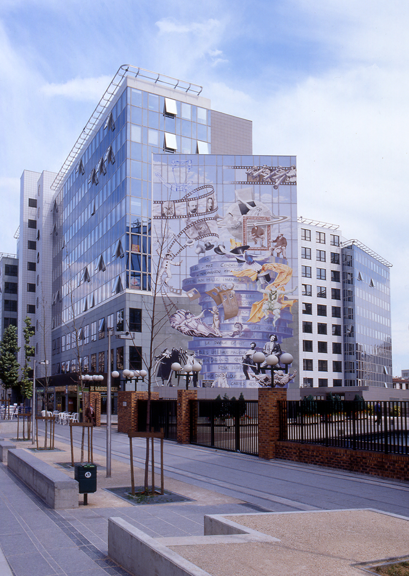Peinture inaugurée en janvier 1991 par la Municipalité de Montreuil en présence de Monsieur Pierre Tchernia et Madame Mélès, petite-fille du cinéaste, qui a très aimablement et largement participé à la composition de la peinture en nous donnant accès à ses archives personnelles, ce dont nous lui sommes très reconnaissants ! (N.B. : pas d’internet à cette époque…!)