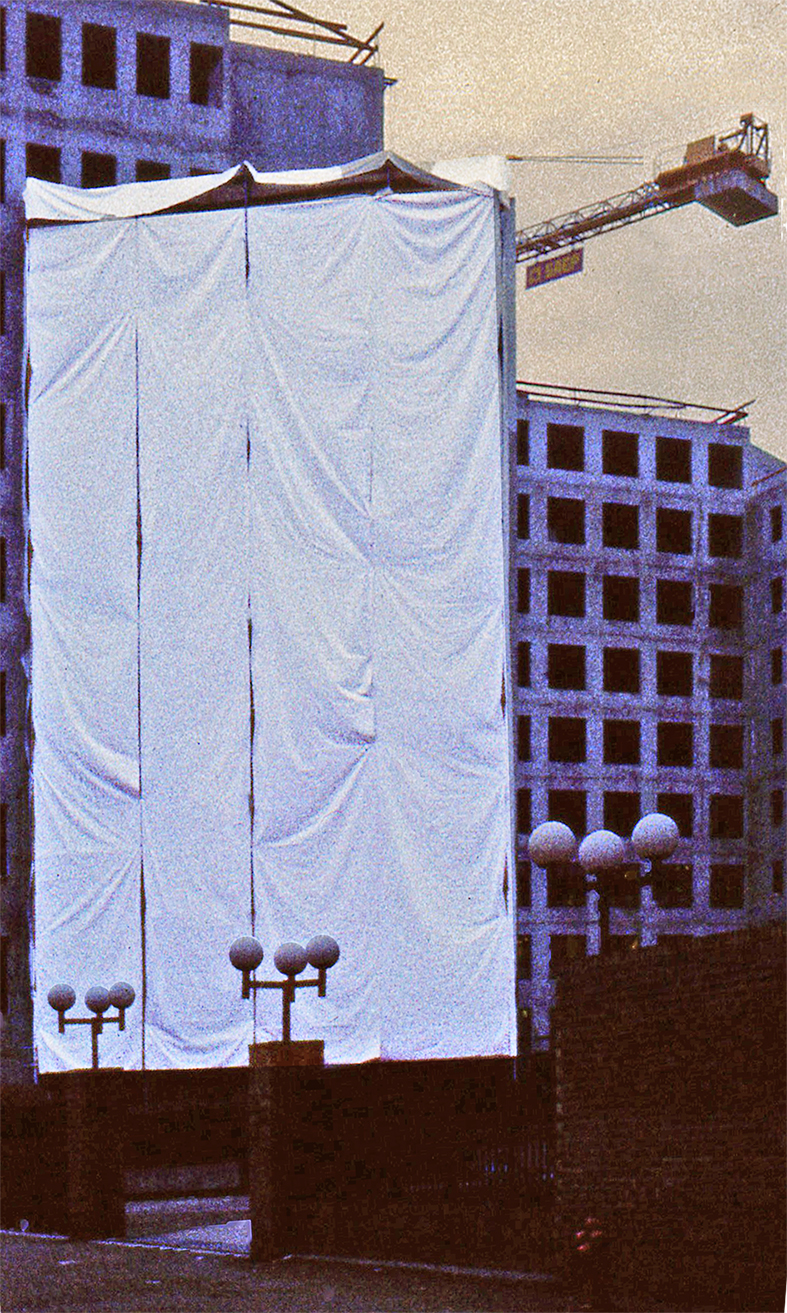 Le bâchage a été obligatoire pour maintenir une température à 6°C minimum (souffleries chauffantes) suivant les prescriptions du fabricant de peinture (KEIM). Les impératifs de chantiers nous contraignaient en effet à travailler en décembre : inauguration programmée début janvier 1991. L’immeuble en construction n’est pas encore « hors-air » ! Journées courtes, un ami électricien de passage dans la région nous installe un réseau d’éclairage au néons !