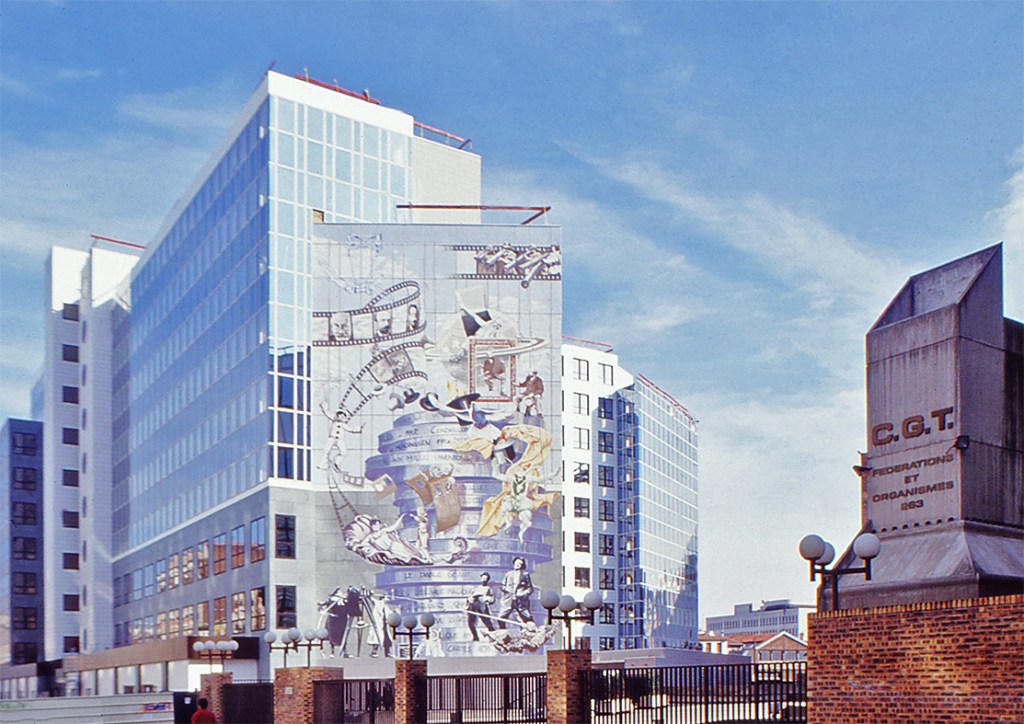 Une fois passé le Périphérique, à la Porte de Montreuil, l’immeuble se situe derrière le siège de la CGT. N.B : Les « pierres agrafées », sous le bandeau blanc du bas du mur sont un décor peint…