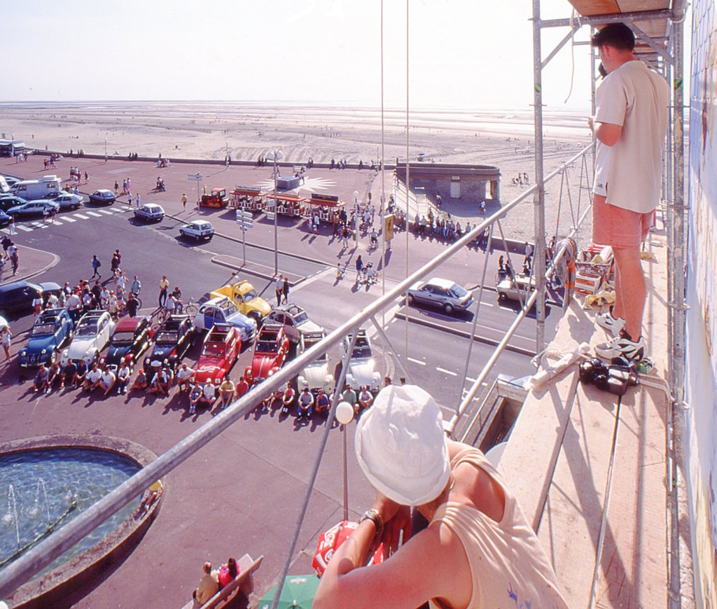 Diaporama ci-dessous : L’échafaudage a d’abord permis la couverture de la façade par une double peau constituée de tuiles en fibrociment posées à clin. Naturel, ce matériau permet l’application de la peinture minérale KEIM, sponsor du projet. Vie et pauses sur l’échafaudage…et la nécessité de « débâcher » régulièrement pour apprécier le rendu…