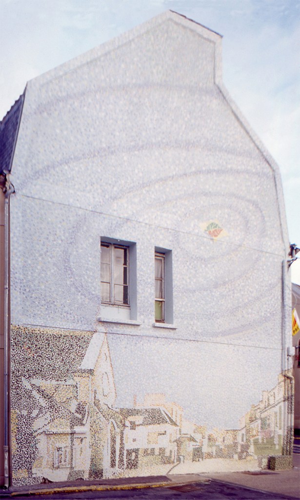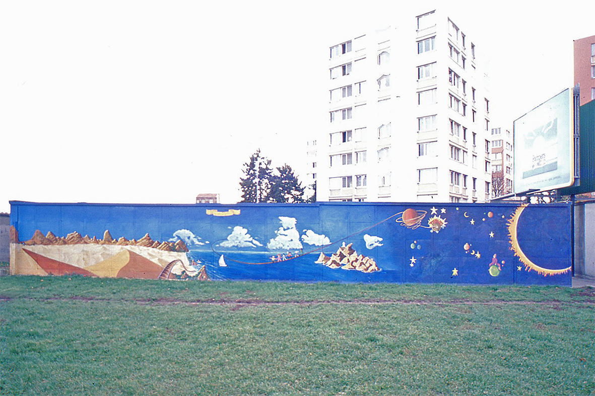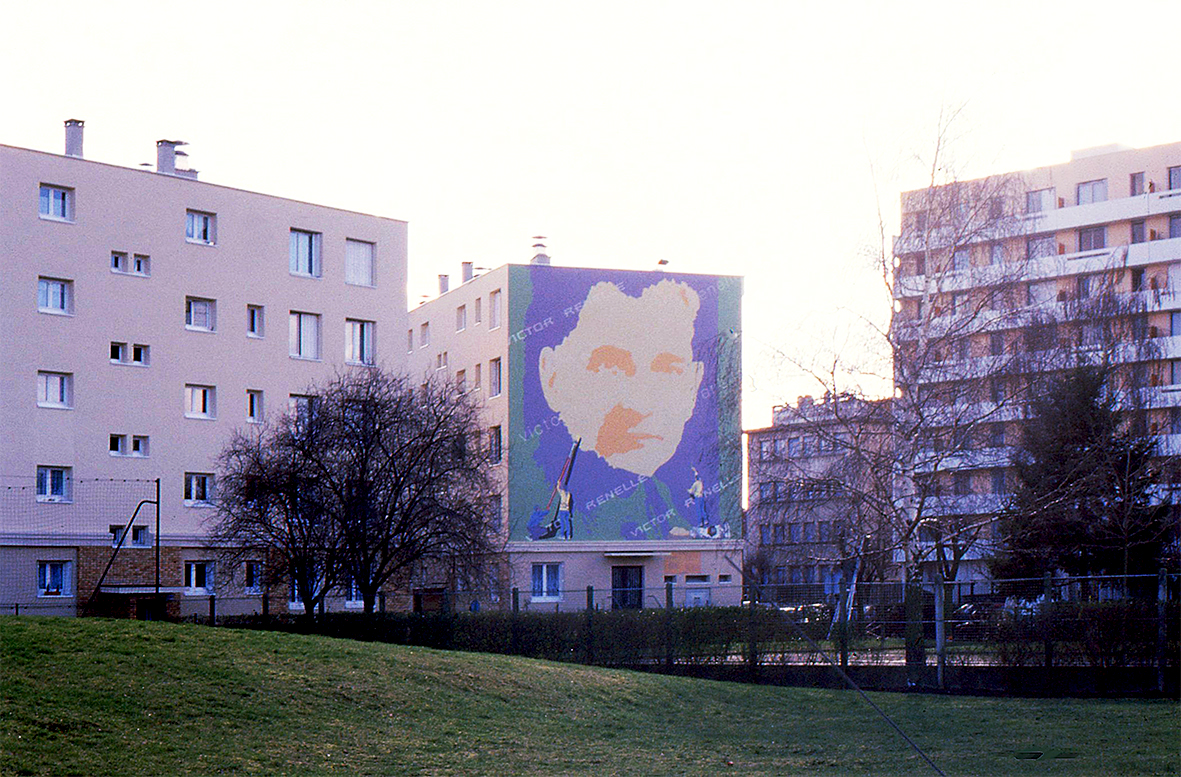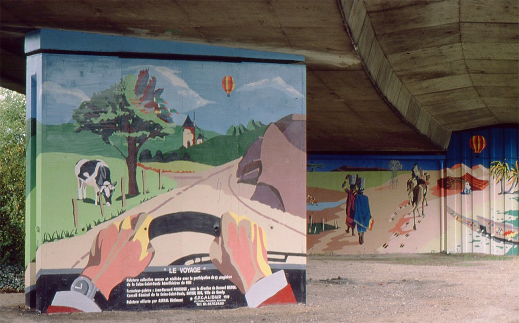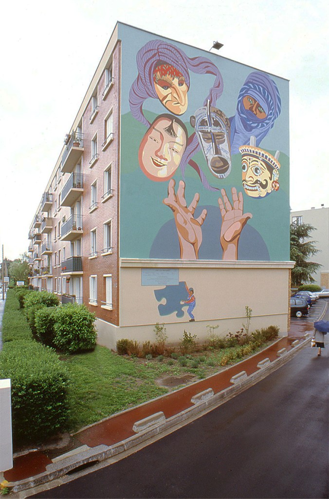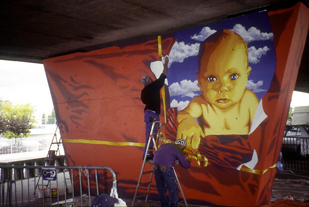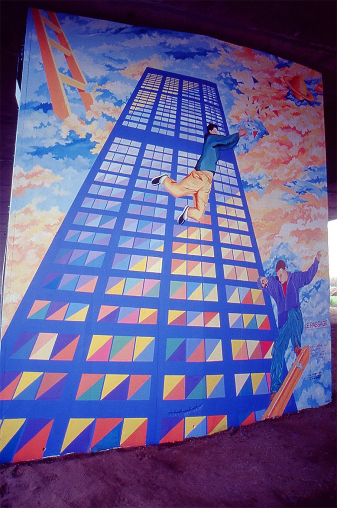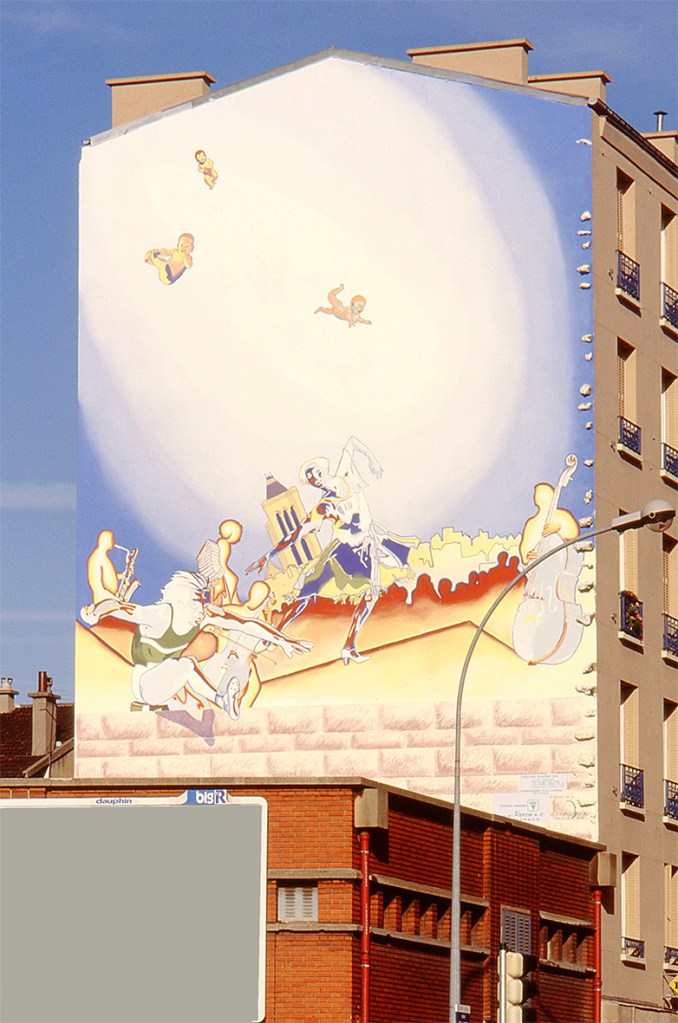 1996. BONDY (93). Pont Polissard. Deux faces de la pile béton d’un auto-pont. (70 m2 env.). Chantier adultes. Cette année voit la mise en avant publique des « bébés » (publicités) : ils apparaîtront sur deux chantiers pourtant très éloignés ! Peinture acrylique.1996. BONDY (93). Pont Polissard. Deux faces de la pile béton d’un auto-pont. (70 m2 env.). Chantier adultes : deux piles traitées. Peinture acrylique.1996. BONDY (93). Pont Polissard. Deux faces de la pile béton d’un auto-pont. (70 m2 env.). Chantier adultes : deux piles traitées, même sujet la deuxième pile, en rouge.1996- MONTREUIL SOUS-BOIS (93). Piscine municipale (90 m2 environ). Chantier adultes.1996. LA PLAINE St-DENIS (93). Station de RER. Stage adultes. (130 m2 env.). Peinture minérale.1996. MONTREUILsous-Bois (93). Quartier des Ruffins, stage de jeunes. (60 m2 env.). Peinture acrylique.1997. BONDY (93). « Galatée ». Participation de l’entreprise de vente produits de pêche ! Stage d’adultes (60m2 env.). Peinture acrylique sur soubassement béton.1997. COURBEVOIE (92). « L’esprit du lieu ». Deux groupes de stagiaires (jeunes et adultes). (800 m2). Peinture acrylique sur un mur d’attente…(aujourd’hui disparu)1997. MONTREUIL-sous-Bois (93). « Montr’œil ». Entrée de la rue commerçante. Stage de jeunes. (50m2 env.). Mur enduit ciment. Peinture minérale. (aujourd’hui disparu)1998. BONDY (93). « Le voyage ». Stagiaires adultes. Pile béton et soutènement d’un auto-pont. (110m2 env.). Peinture acrylique.1998. LE RAINCY (93). « XIXe siècle et saltimbanques ». Deux palissades de chantier. (50 m2 env.). Peinture acrylique. 1998. MONTREUIL-sous-Bois (93). « Aimons la ville, vivons ensemble ». Groupe de jeunes. (2x15m2). Peinture acrylique.1998. STAINS (93). « Hommage à Victor Renelle » résistant qui a donné son nom à cette résidence. Groupe de jeunes. (100 m2). 3 réalisations : inauguration ministérielle (Mme M.-G. Buffet) Peinture acrylique sur isolation extérieure neuve.1999. STAINS (93). Cité Victor Renelle. Stage adultes (100 m2). Peinture acrylique sur isolation extérieure.1999. STAINS (93). « Débarqués ». Cité Victor Renelle. Stage adultes (100 m2). Peinture acrylique sur isolation extérieure.1999. BOBIGNY (93). DDJS. « Olympiades ». Groupe de jeunes. (75 m2 env.). Peinture acrylique sur mur enduit ciment.1999. BONDY (93) « Le Passage ». Chantier adultes. Pile béton de pont autoroutier. (35 m2 env.). Peinture acrylique.1999. BONDY (93). Chantier adultes. Pile béton d’un auto-pont. Groupe d’adultes. (70 m2 env.). Peinture acrylique,1999. PARIS. Université de Paris VI-Jussieu. Stage de jeunes. Cage d’escalier d’accès aux salles et amphithéâtres. (50 m2 env.). Mur de béton. Peinture acrylique. 2000. ATHIS-MONS (91). « Le vieil Athis ». Impressionnisme. Accès à une zone piétonne. Stage de jeunes. (60 m2 env.) Peinture minérale.2000. COURBEVOIE (92). « Voyage ». Stage de jeunes. Façade de l’Hôtel Clarine (120 m2 env.). Peinture acrylique.