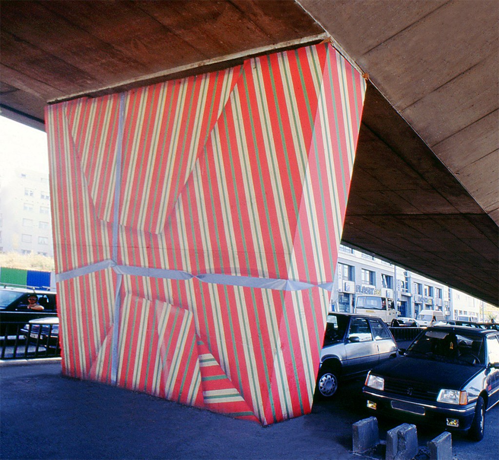 1995 Décembre. BONDY (93). Deux faces de la pile béton d’un auto-pont. (70 m2env.). Premier chantier EXCALIBUR : les adultes «offrent leurs deux paquets cadeaux (avant Noël)» aux passants….1995 Décembre. BONDY (93). Deuxième pile béton de l’auto-pont. (70 m2env..). Les adultes «offrent ces paquets cadeaux » aux passants….